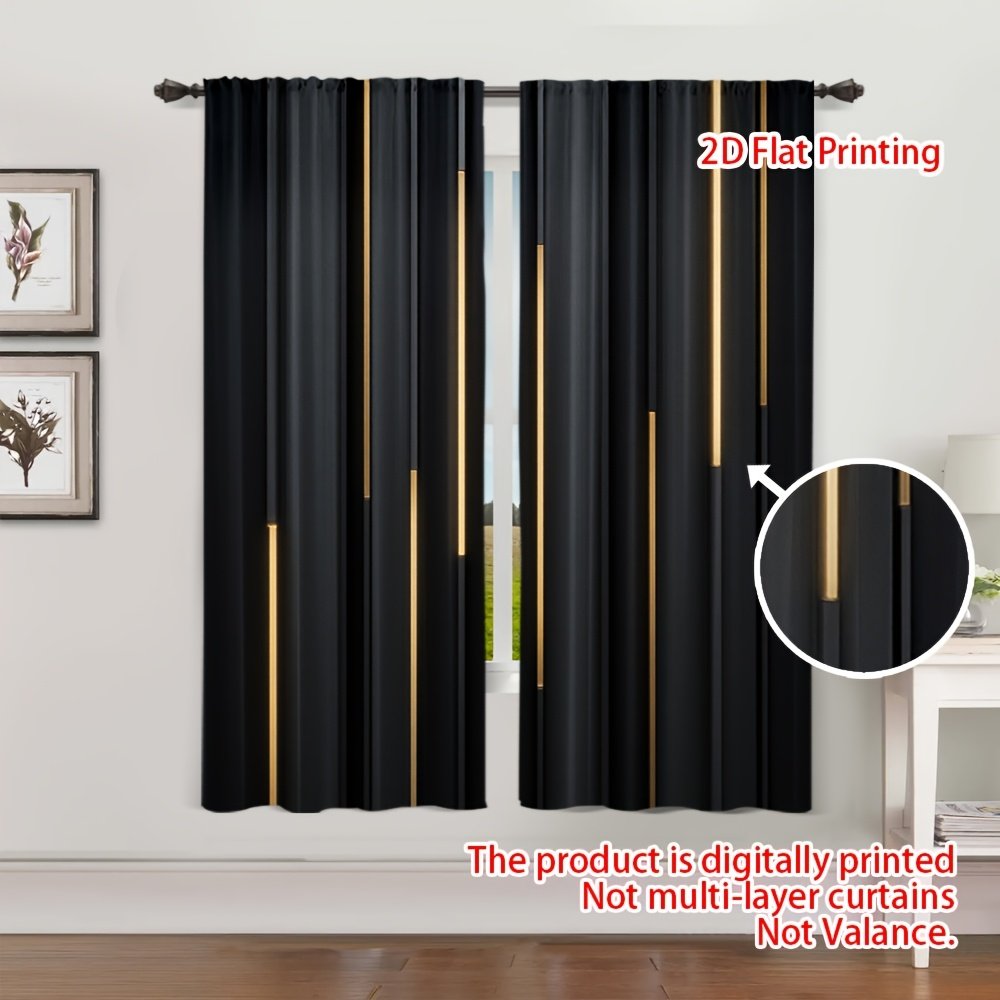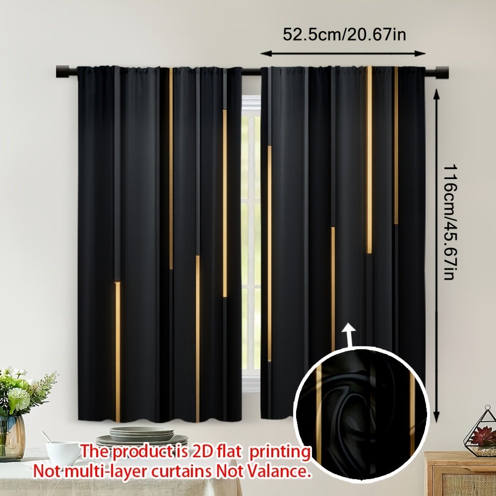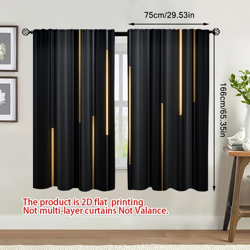 2D Flat – 2pcs Elegant Black and Golden Vertical Stripe Curtains | Polyester, Semi-Sheer, Machine Washable, Rod Pocket Style, Contemporary Design for Living Room, Bedroom & Study Decor