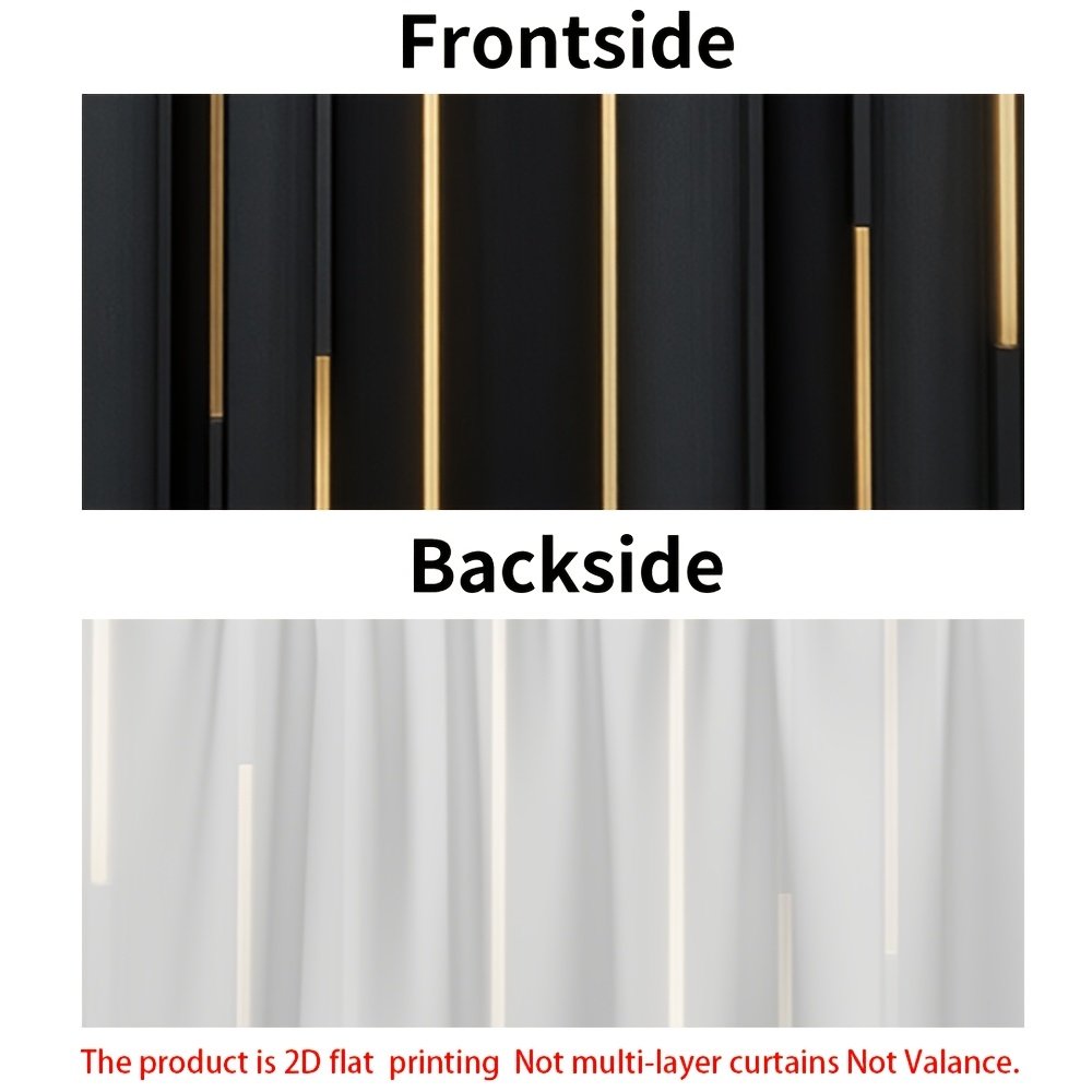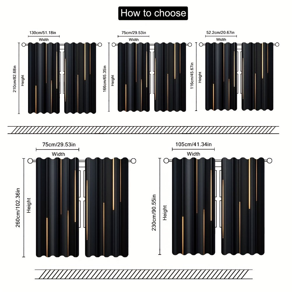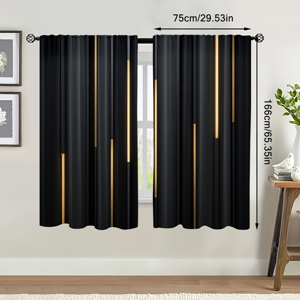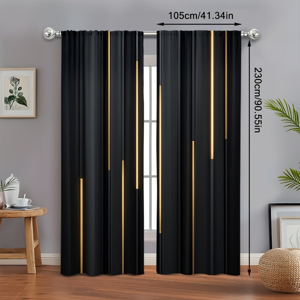 2D Flat – 2pcs Elegant Black and Golden Vertical Stripe Curtains | Polyester, Semi-Sheer, Machine Washable, Rod Pocket Style, Contemporary Design for Living Room, Bedroom & Study Decor